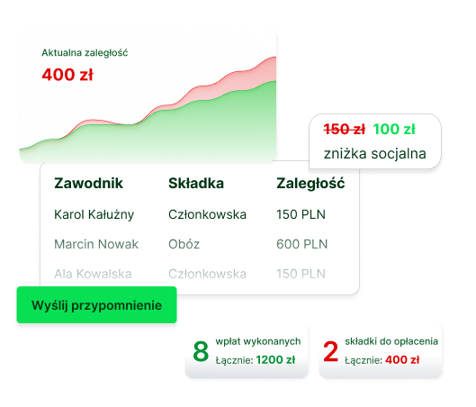 Moduły umożliwiają monitorowanie składek, wystawianie faktur, generowanie raportów finansowych oraz obsługę płatności online i automatycznych przypomnień o zaległościach.